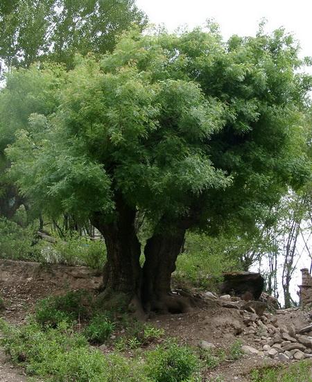落葉喬木,高達30m,胸徑2m,樹冠近圓球形;樹皮薄片狀剝落。通常為偶數羽狀復葉,小葉10~14,披針形或卵狀披針形,長5~9cm,先端漸尖,基部偏斜,全緣。雌雄異株,圓錐花序,雄花序淡綠色,雌花序紫紅色。核果徑約6mm,初為黃白色,后變紅色至藍紫色,若紅而不紫多為空粒。花期3~4月,先葉開放;果9~11月成熟。