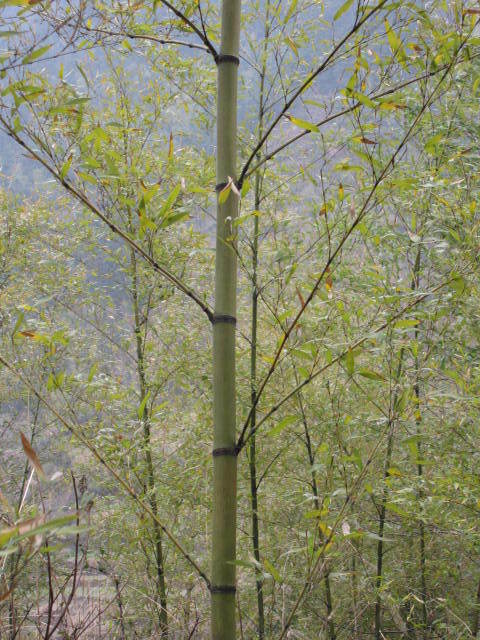 喬木狀竹種,地下莖單軸散生。稈挺直,高8~22米,徑4~14厘米,稈綠色,無毛,老竹在節(jié)下有環(huán);節(jié)間在分枝一側(cè)有縱溝;新枝微被。節(jié)處呈兩環(huán),隆起。葉二至五枚生于小枝,長橢圓狀披針形,夏秋季翠綠色,冬季轉(zhuǎn)黃色。筍期5月。常見的栽培變種有:碧玉間黃金竹(P.viridis F.houzeauana),竹稈綠色,縱槽淡黃綠色,故又名槽里黃剛竹或綠皮黃筋竹。